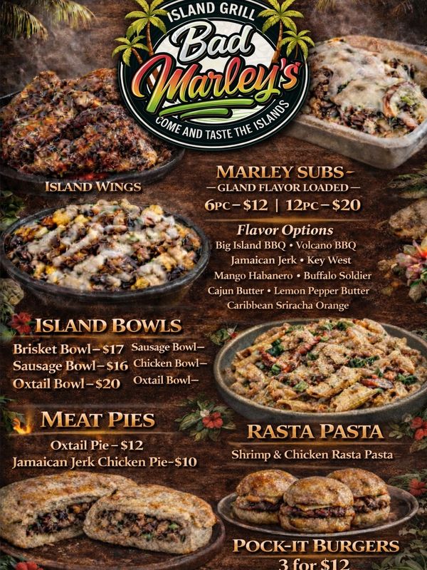 The history of this company didn't just start in 2022. It started many, many years ago in a small kitchen in Minneapolis, Minnesota. Dan began creating his own homemade Souperior Brand Soups and Sauces, He eventually opened his first restaurant in 1999. With his latest creation of the Bad Marley’s brand, which includes his marinades, seasonings, and sauces. has inspired his vision for Bad Marley's "The Mobile Island Grill," featuring "The Marley" an island panini, the island bowls, the pineapple boat, Island inspired salads and smoked meats, makes this place stand out as one of his most creative concepts.